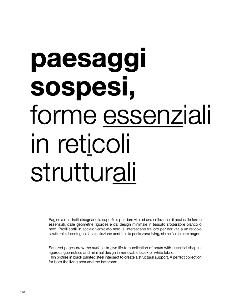 Squared pages draw the surface to give life to a collection of poufs with essential shapes,