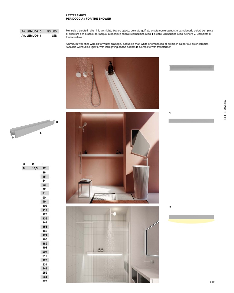 di fresatura per lo scolo dell’acqua. Disponibile senza illuminazione a led 1 o con illuminazione a led inferiore 2. Completa di