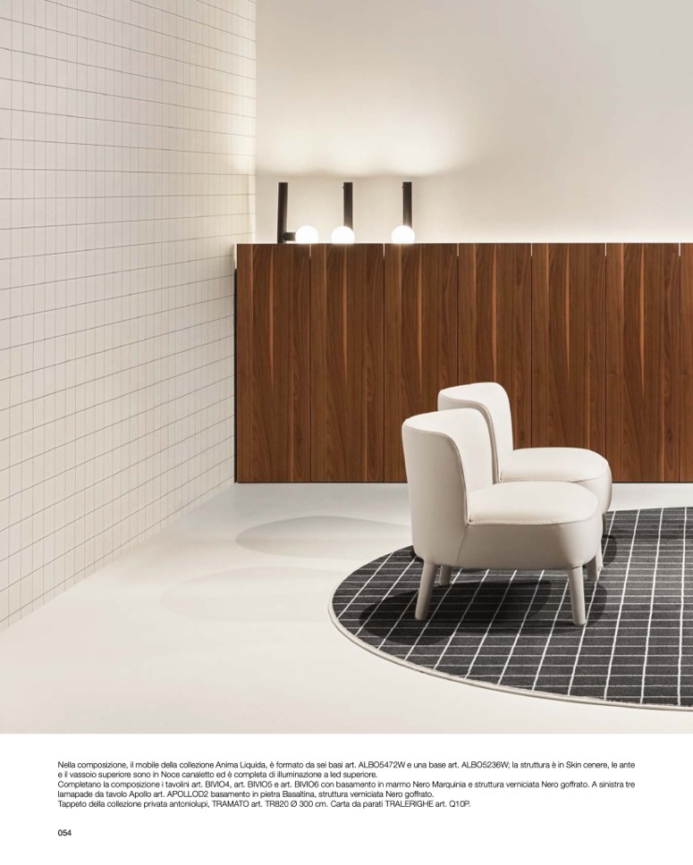 Nella composizione, il mobile della collezione Anima Liquida, è formato da sei basi art. ALBO5472W e una base art. ALBO5236W; la struttura è in Skin cenere, le ante