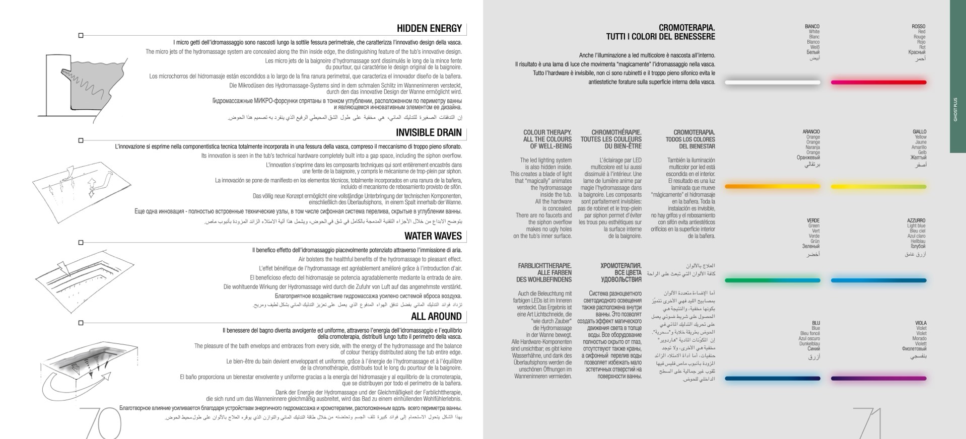 El baño proporciona un bienestar envolvente y uniforme gracias a la energía del hidromasaje y al equilibrio de la cromoterapia,