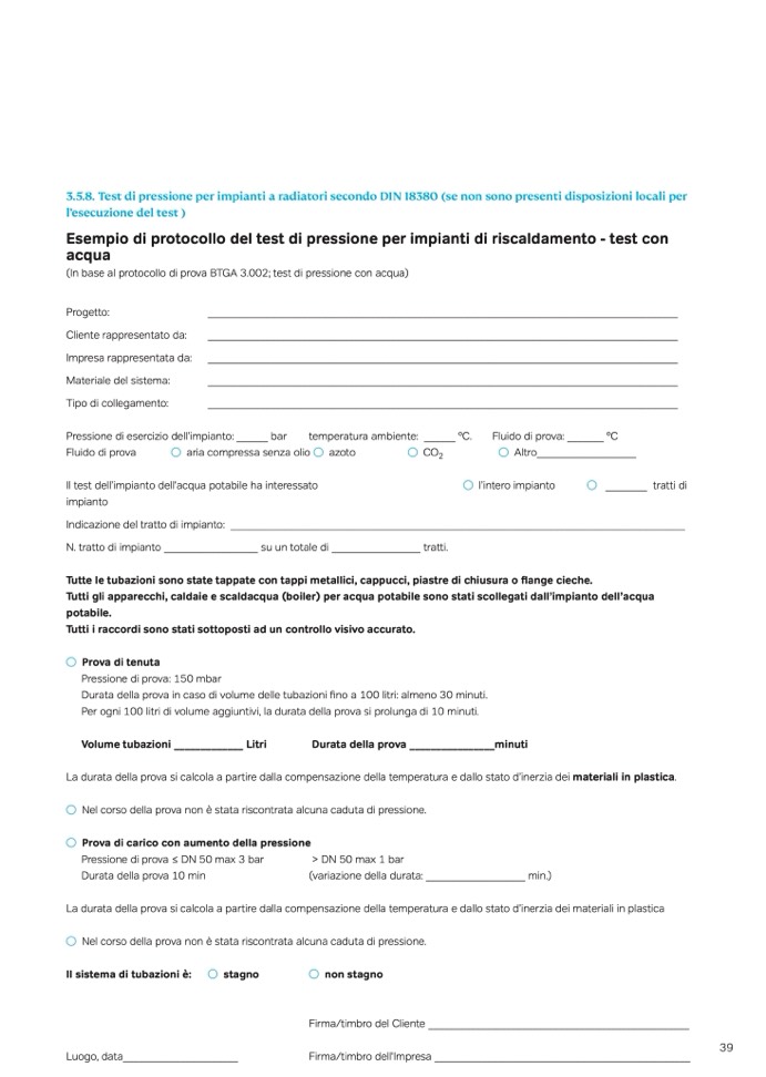 3.5.8. Test di pressione per impianti a radiatori secondo DIN 18380 (se non sono presenti disposizioni locali per