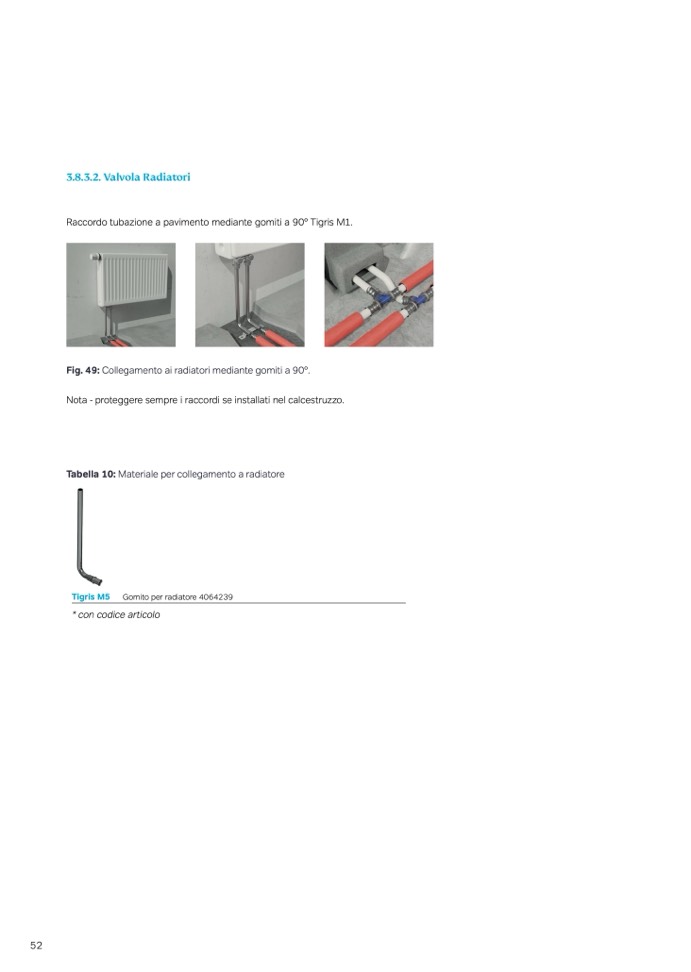 Raccordo tubazione a pavimento mediante gomiti a 90° Tigris M1.
