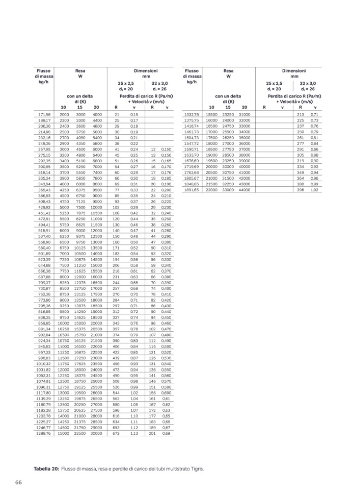 Tabella 20: Flusso di massa, resa e perdite di carico dei tubi multistrato Tigris.