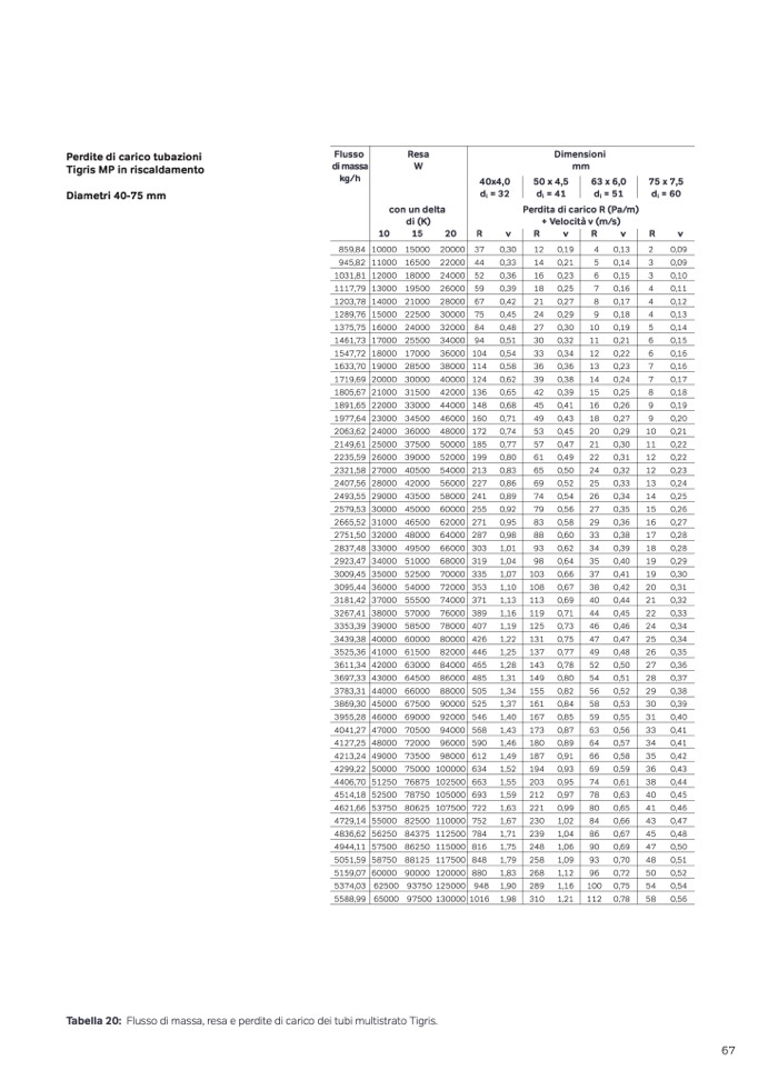 Tabella 20: Flusso di massa, resa e perdite di carico dei tubi multistrato Tigris.