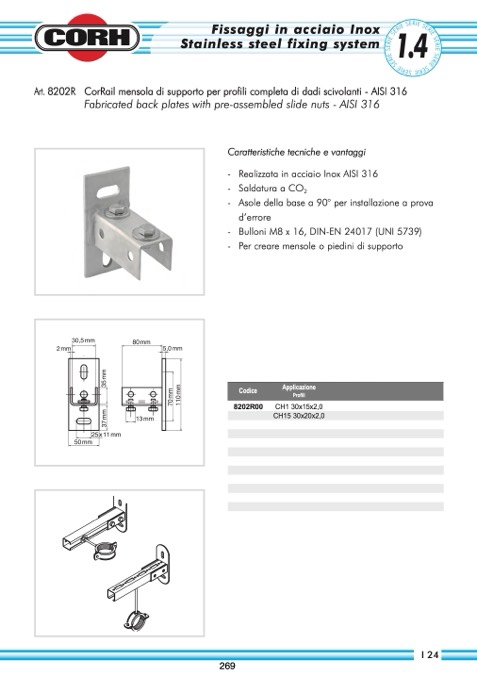 CorRail mensola di supporto per profili completa di dadi scivolanti - AISI 316