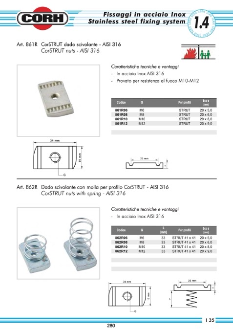 Art. 862R Dado scivolante con molla per profilo CorSTRUT - AISI 316