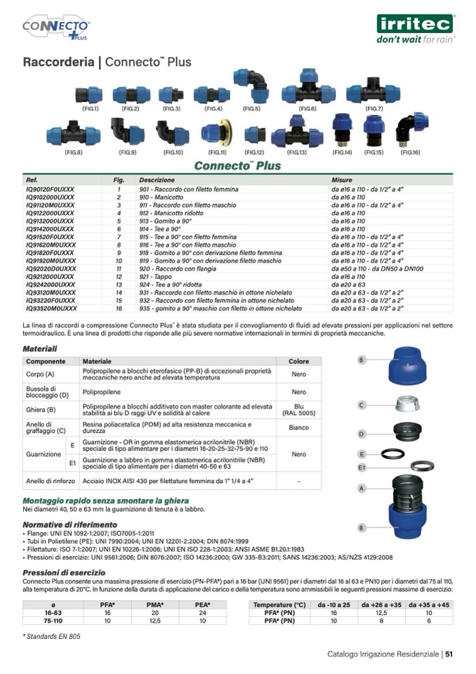 Connecto Plus consente una massima pressione di esercizio (PN-PFA*) pari a 16 bar (UNI 9561) per i diametri dal 16 al 63 e PN10 per i diametri dal 75 al 110,
