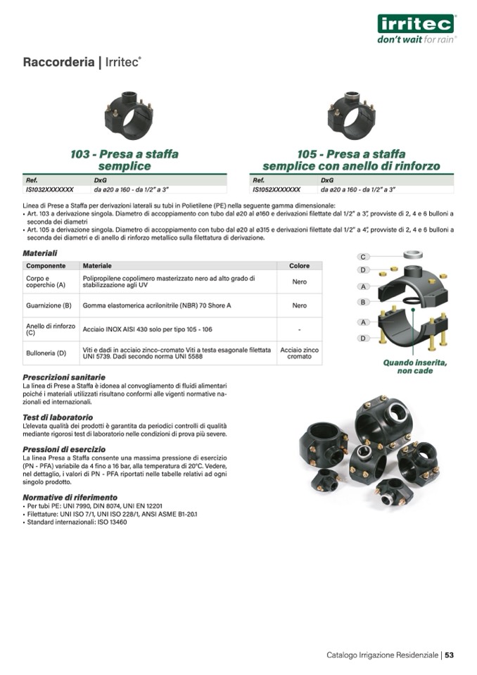 • Art. 105 a derivazione singola. Diametro di accoppiamento con tubo dal ø20 al ø315 e derivazioni filettate dal 1/2” a 4”, provviste di 2, 4 e 6 bulloni a