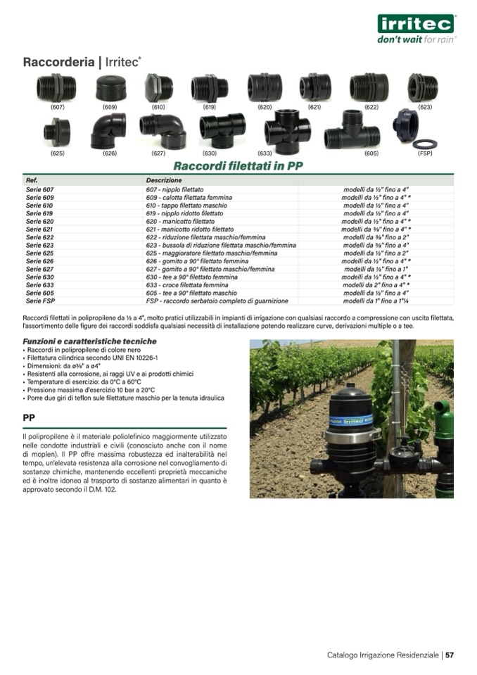 1⁄2 a 4", molto pratici utilizzabili in impianti di irrigazione con qualsiasi raccordo a compressione con uscita filettata,