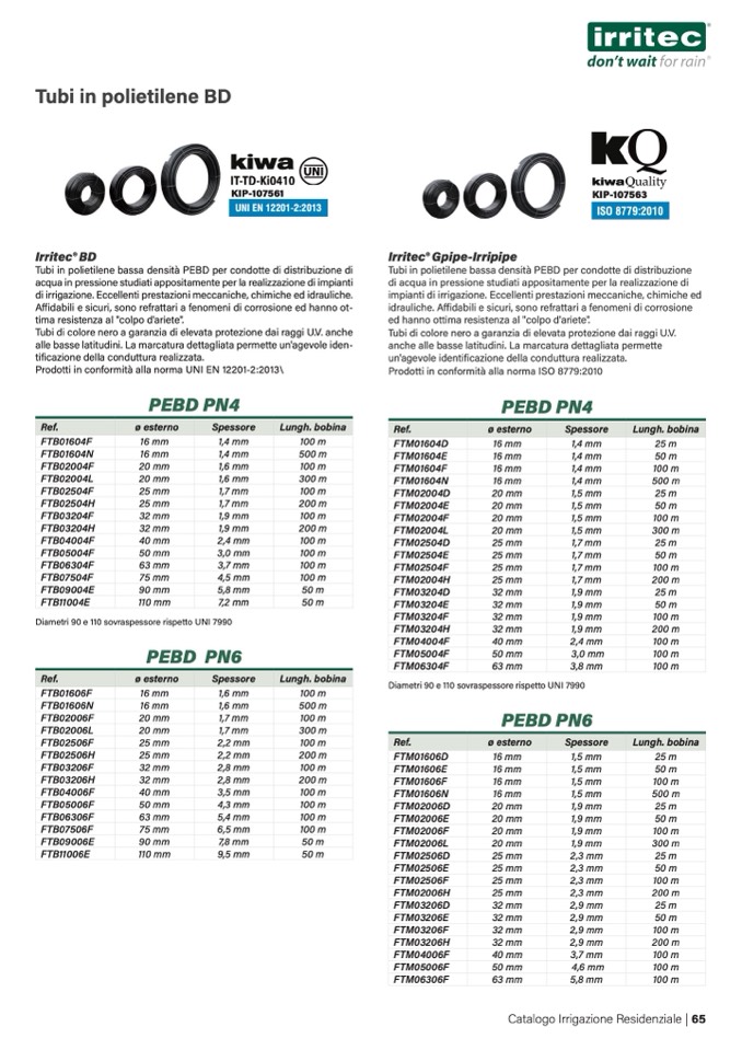 di irrigazione. Eccellenti prestazioni meccaniche, chimiche ed idrauliche.