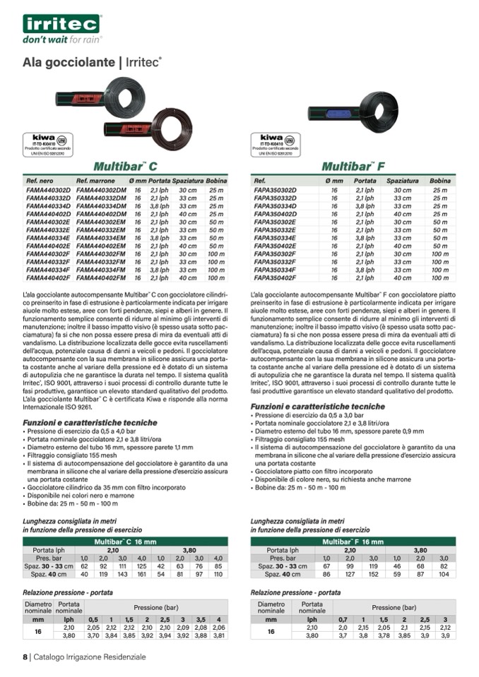 • Portata nominale gocciolatore 2,1 e 3,8 litri/ora