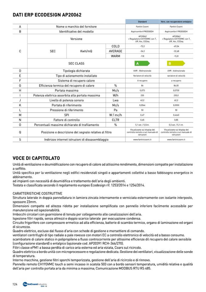 Testata e classificata secondo il regolamento europeo Ecodesign rif. 1253/2014 e 1254/2014.