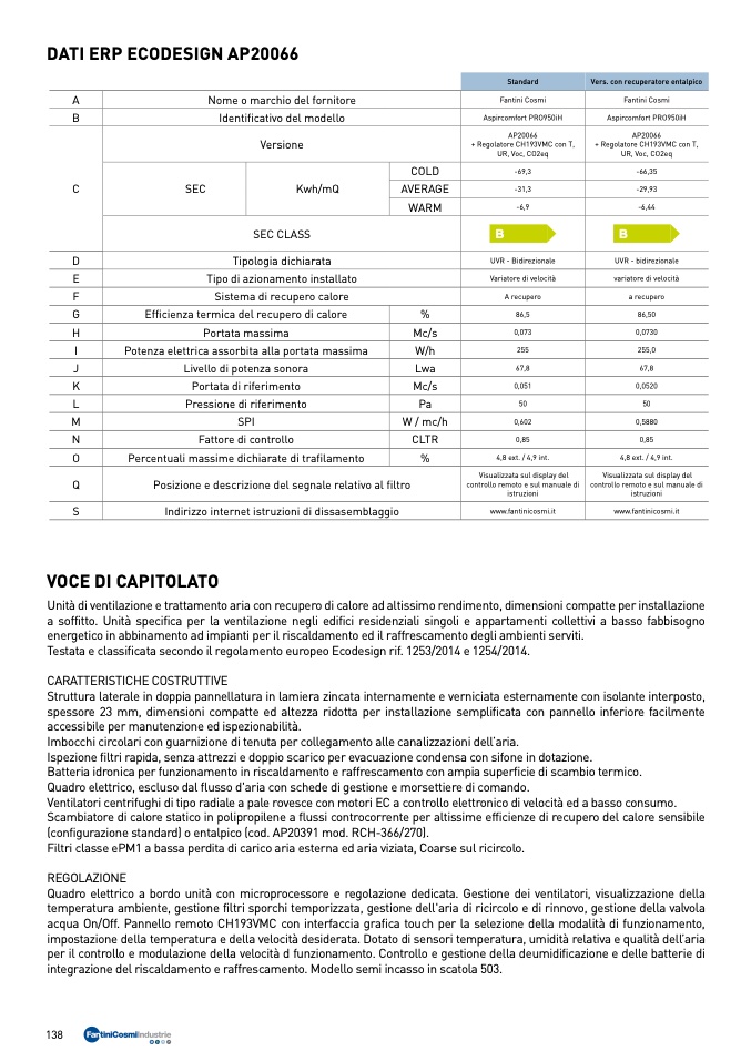 Testata e classificata secondo il regolamento europeo Ecodesign rif. 1253/2014 e 1254/2014.