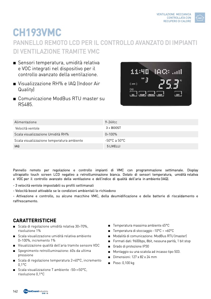 Pannello remoto per regolazione e controllo impianti di VMC con programmazione settimanale. Display