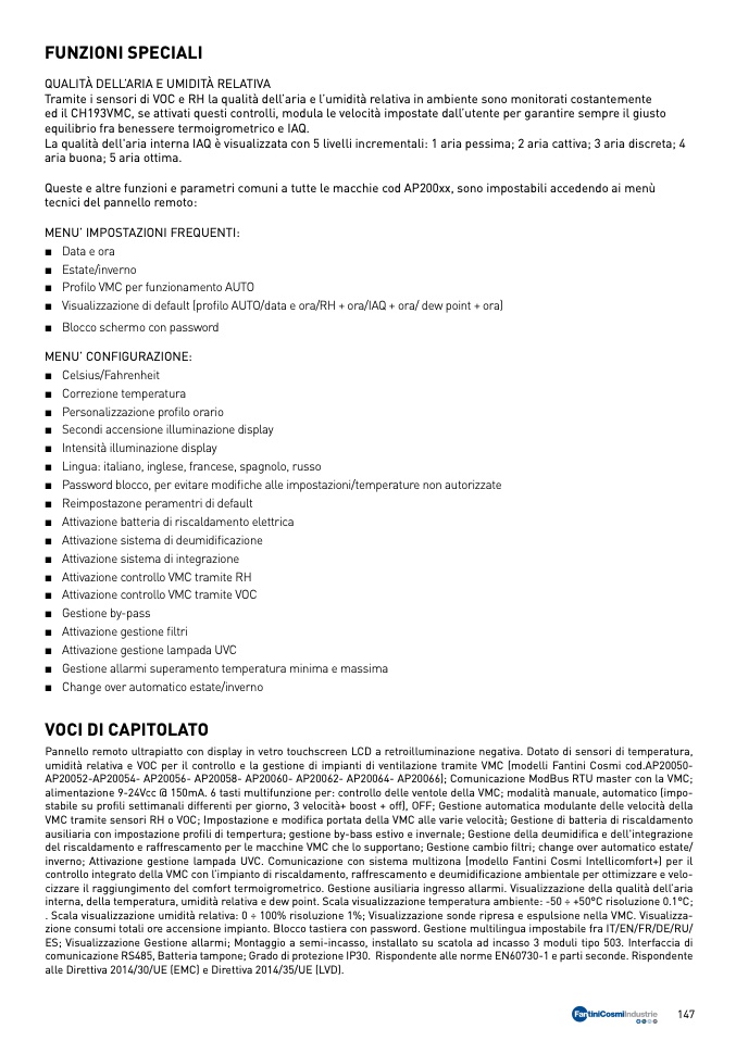 VMC tramite sensori RH o VOC; Impostazione e modifica portata della VMC alle varie velocità; Gestione di batteria di riscaldamento