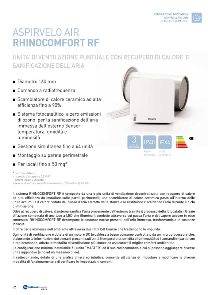 Il sistema RHINOCOMFORT RF è composto da una o più unità di ventilazione decentralizzata con recupero di calore