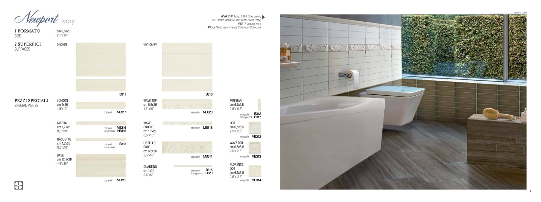 B301 White Moon; MB311 Surf Listello Ivory;