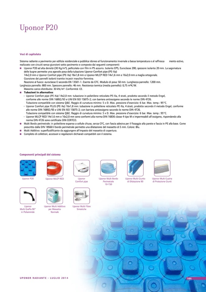 Uponor P20 ad alta densità (30 Kg/m3), pellicolato con film in PS azzurro. Isolante EPS, Euroclasse 200, spessore isolante 20 mm. La sagomatura