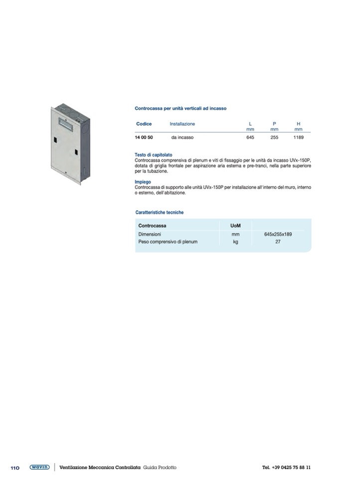 Controcassa di supporto alle unità UVx-150P per installazione all'interno del muro, interno