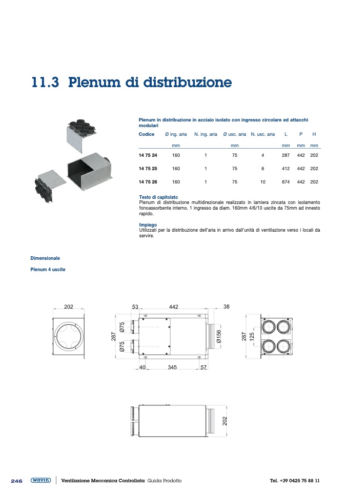 fonoassorbente interno. 1 ingresso da diam. 160mm 4/6/10 uscite da 75mm ad innesto