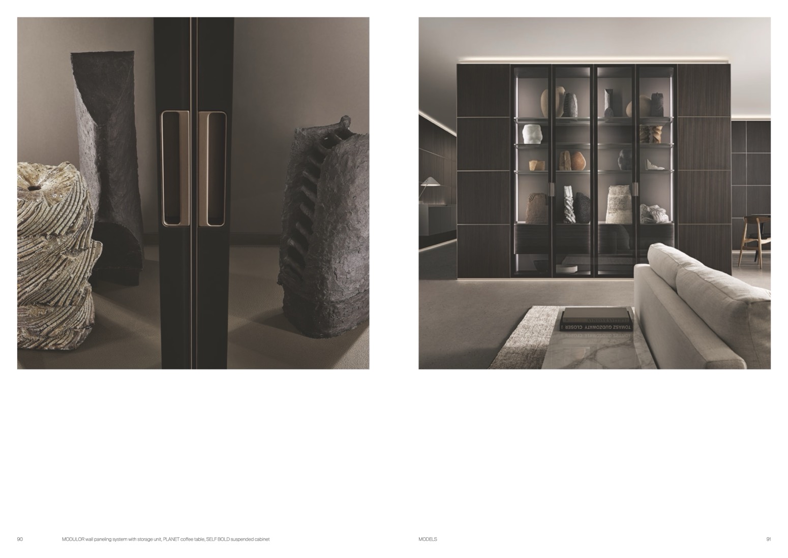 MODULOR wall paneling system with storage unit, PLANET coffee table, SELF BOLD suspended cabinet