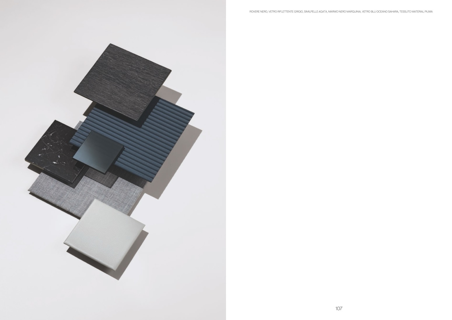 ROVERE NERO, VETRO RIFLETTENTE GRIGIO, SIMILPELLE AGATA, MARMO NERO MARQUINIA, VETRO BLU OCEANO SAHARA, TESSUTO MATERIAL PIUMA