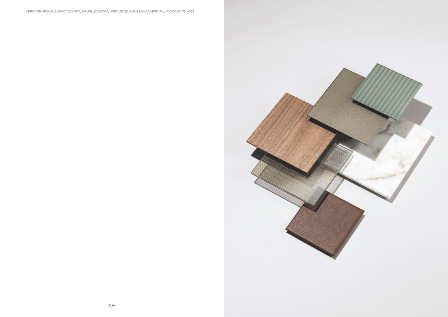 VETRO FIBRA BRONZO, MARMO CALACATTA, SIMILPELLE CASTORO, VETRO VERDE LICHENE SAHARA, VETRO PALLADIO DIAMANTE, NOCE