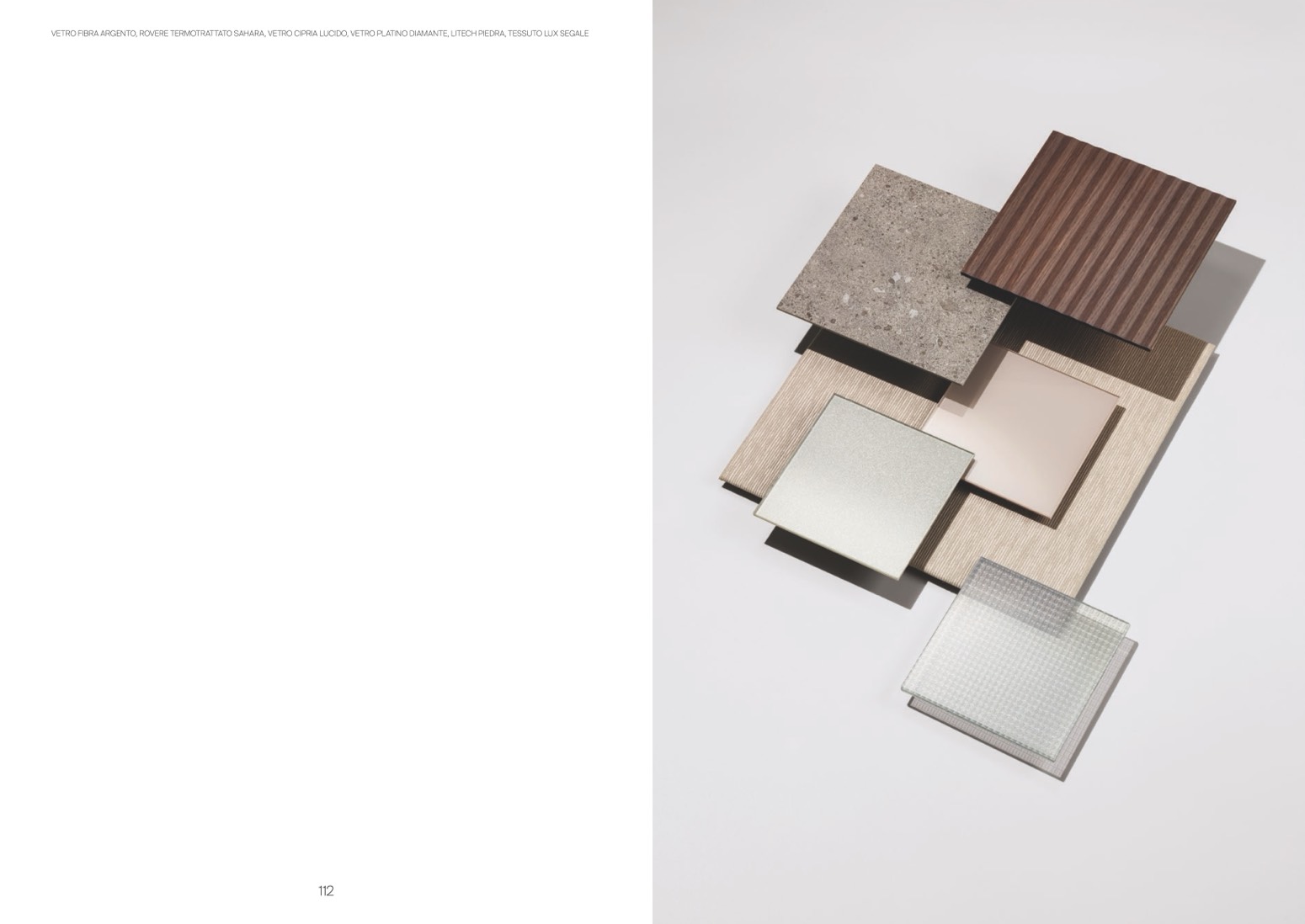 VETRO FIBRA ARGENTO, ROVERE TERMOTRATTATO SAHARA, VETRO CIPRIA LUCIDO, VETRO PLATINO DIAMANTE, LITECH PIEDRA, TESSUTO LUX SEGALE