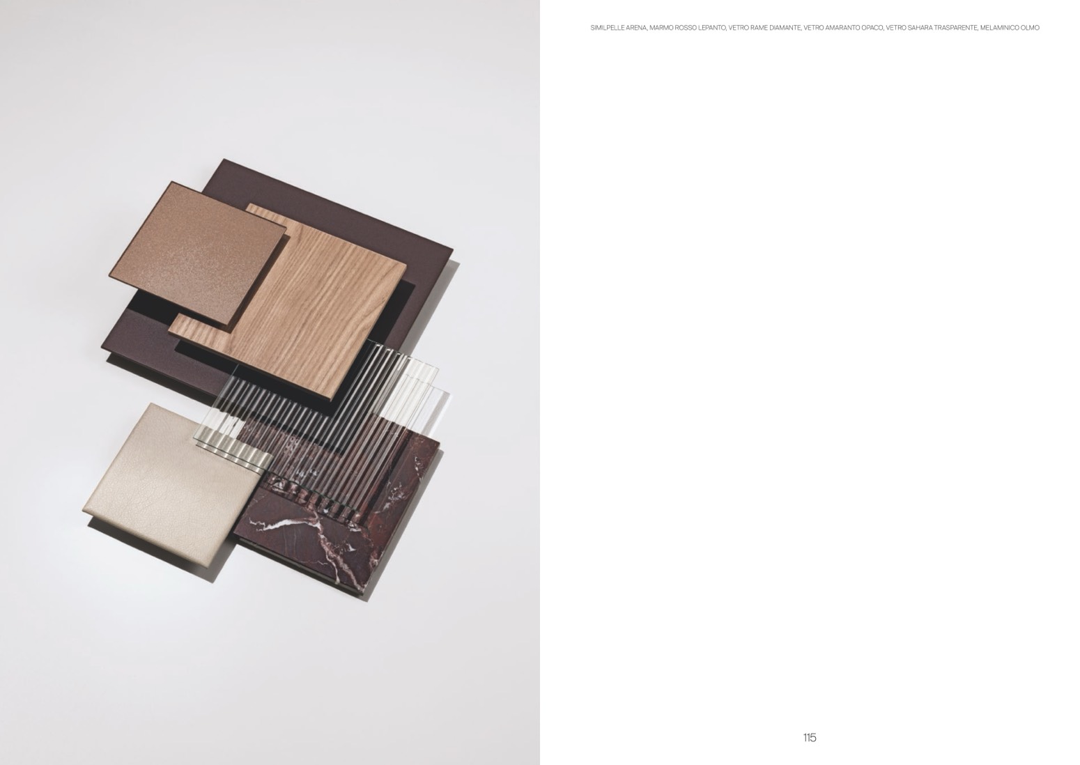 SIMILPELLE ARENA, MARMO ROSSO LEPANTO, VETRO RAME DIAMANTE, VETRO AMARANTO OPACO, VETRO SAHARA TRASPARENTE, MELAMINICO OLMO