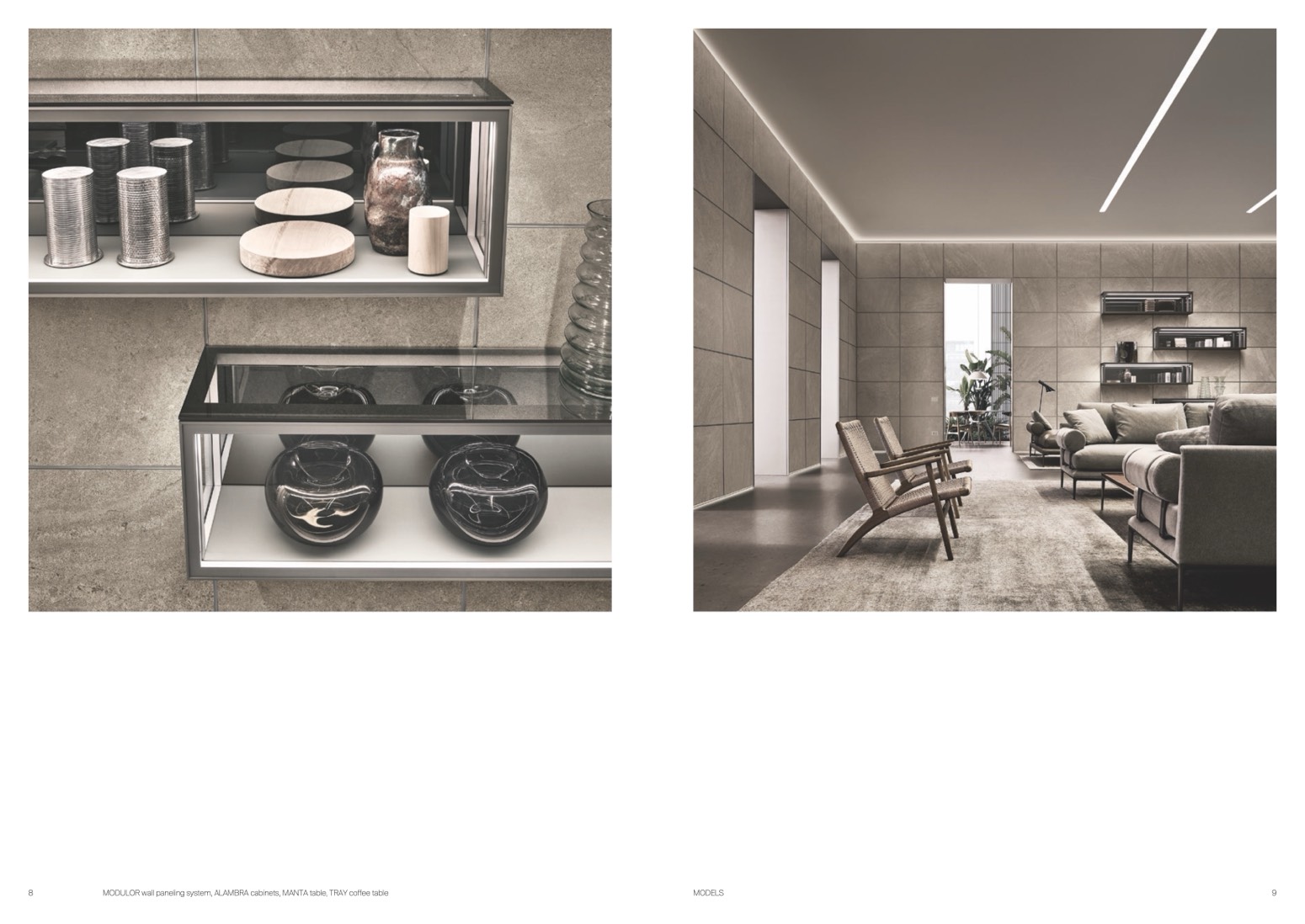 MODULOR wall paneling system, ALAMBRA cabinets, MANTA table, TRAY coffee table