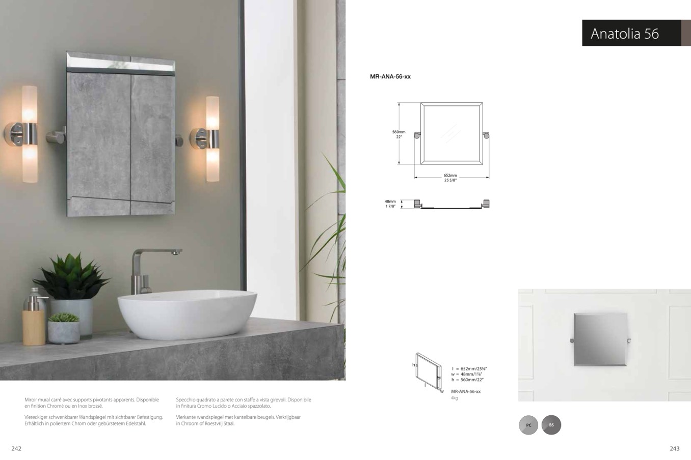 Miroir mural carré avec supports pivotants apparents. Disponible