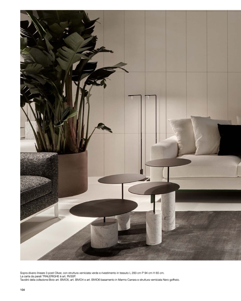 Tavolini della collezione Bivio art. BIVIO5, art. BIVIO4 e art. BIVIO6 basamento in Marmo Carrara e struttura verniciata Nero goffrato.