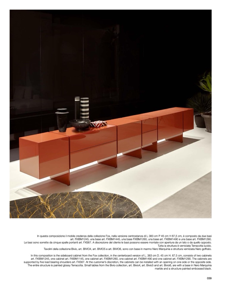 In this composition is the sideboard cabinet from the Fox collection, in the centerboard version of L. 383 cm D. 45 cm H. 67.5 cm, consists of two cabinets