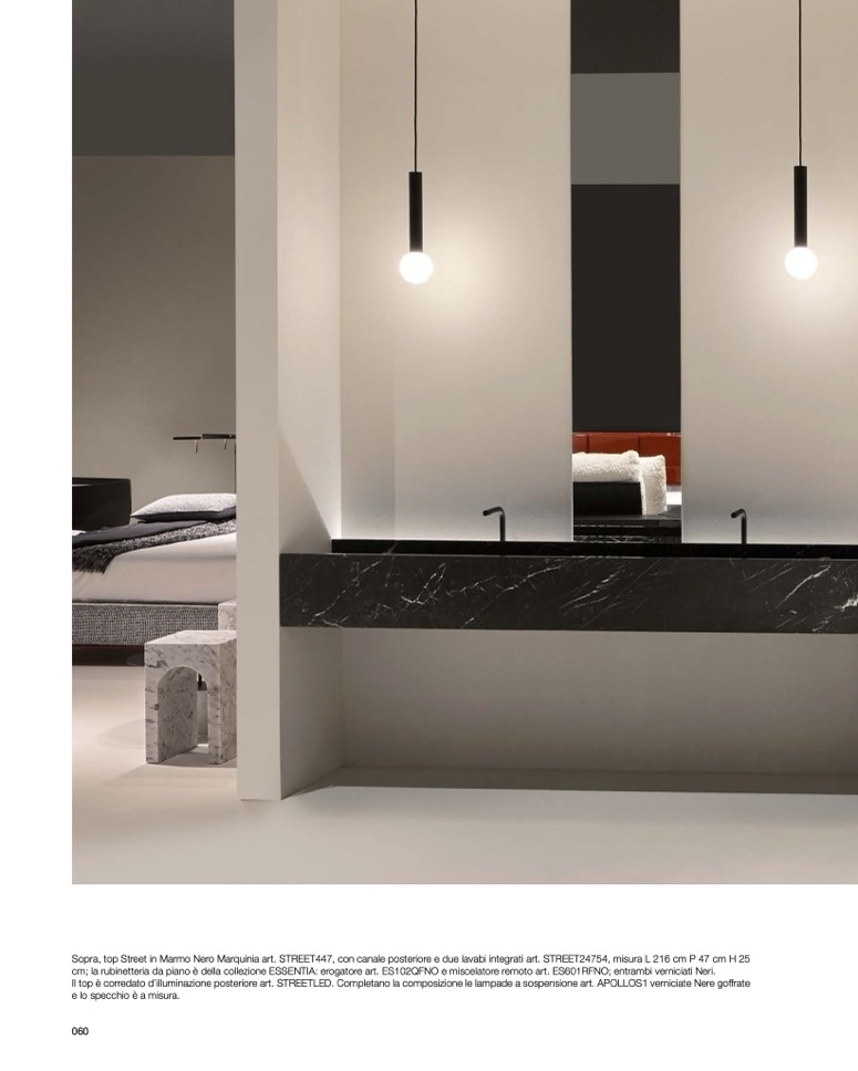 Il top è corredato d’illuminazione posteriore art. STREETLED. Completano la composizione le lampade a sospensione art. APOLLOS1 verniciate Nere goffrate
