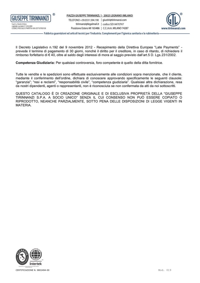 Competenza Giudiziaria: Per qualsiasi controversia, foro competente è quello della ditta fornitrice.