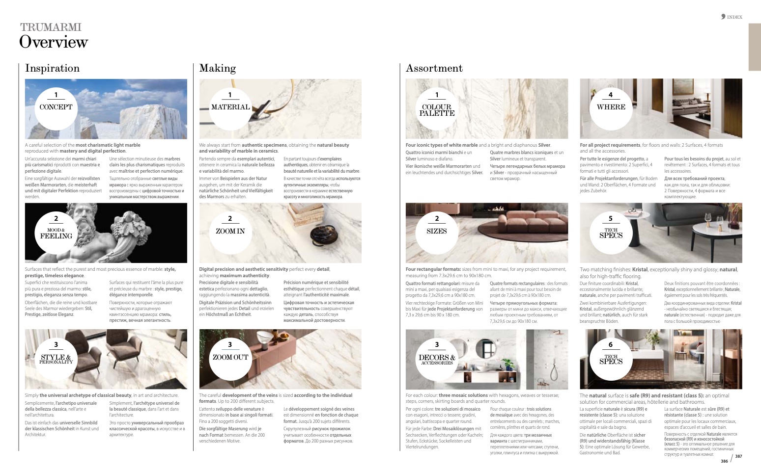 Four iconic types of white marble and a bright and diaphanous Silver.