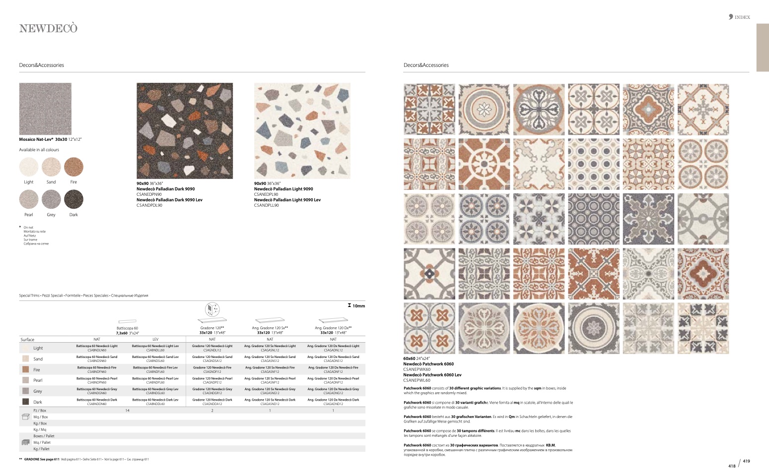Patchwork 6060 si compone di 30 varianti grafiche. Viene fornita al mq in scatole, all’interno delle quali le