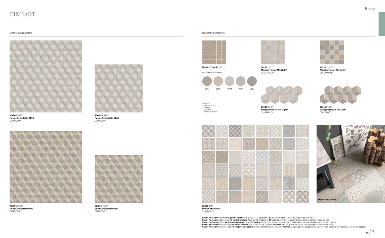 Fineart Patchwork si compone di 48 varianti grafiche. Viene fornita in scatole da 17 pezzi, all’interno delle quali le grafiche sono miscelate in modo casuale.