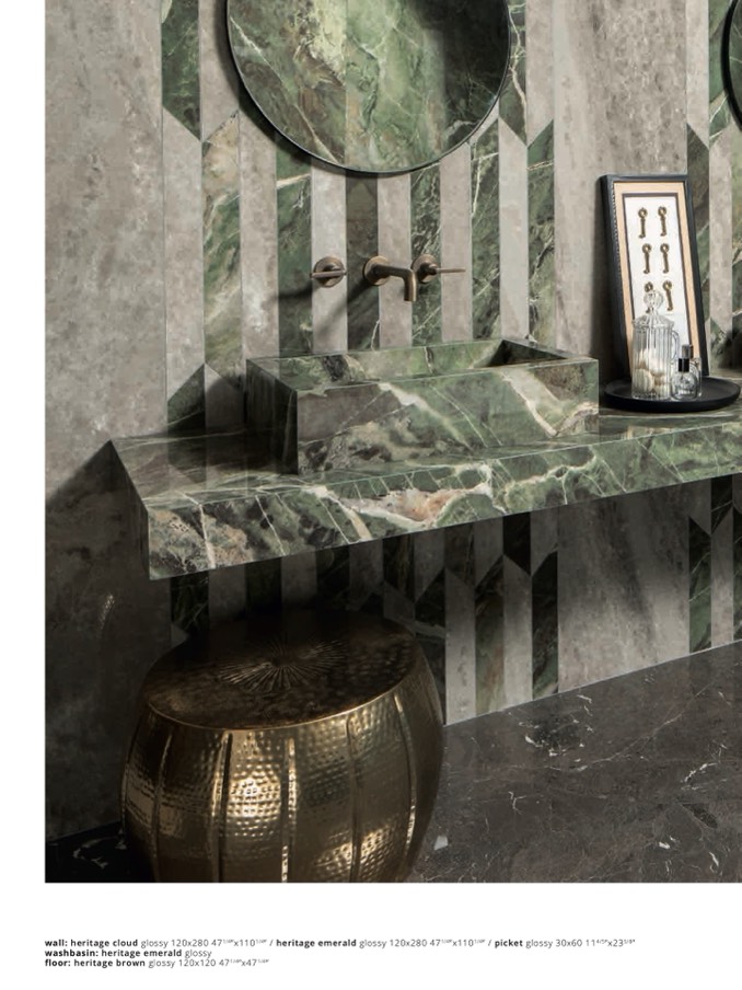 wall: heritage cloud glossy 120x280 471/4”x1101/4” / heritage emerald glossy 120x280 471/4”x1101/4” / picket glossy 30x60 114/5”x235/8”