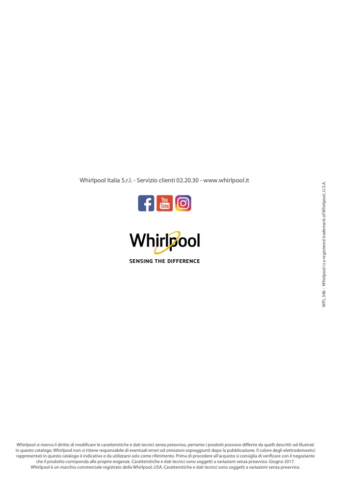 in questo catalogo. Whirlpool non si ritiene responsabile di eventuali errori od omissioni sopraggiunti dopo la pubblicazione. Il colore degli elettrodomestici