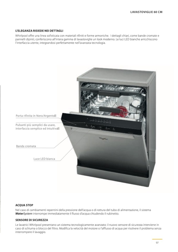 Whirlpool offre una linea sofisticata con materiali rifiniti e forme armoniche. I dettagli chiari, come bande cromate e