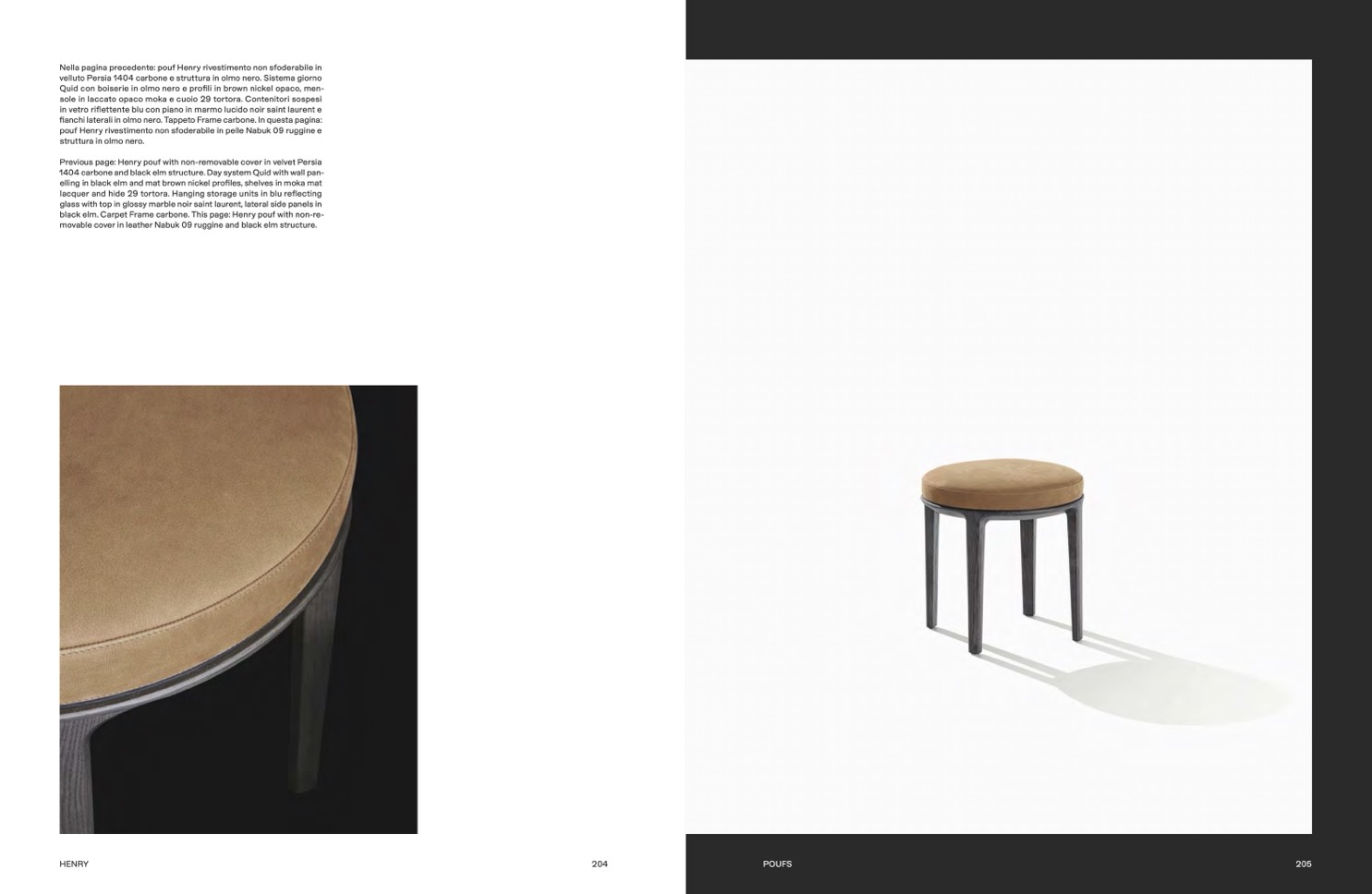 black elm. Carpet Frame carbone. This page: Henry pouf with non-re-