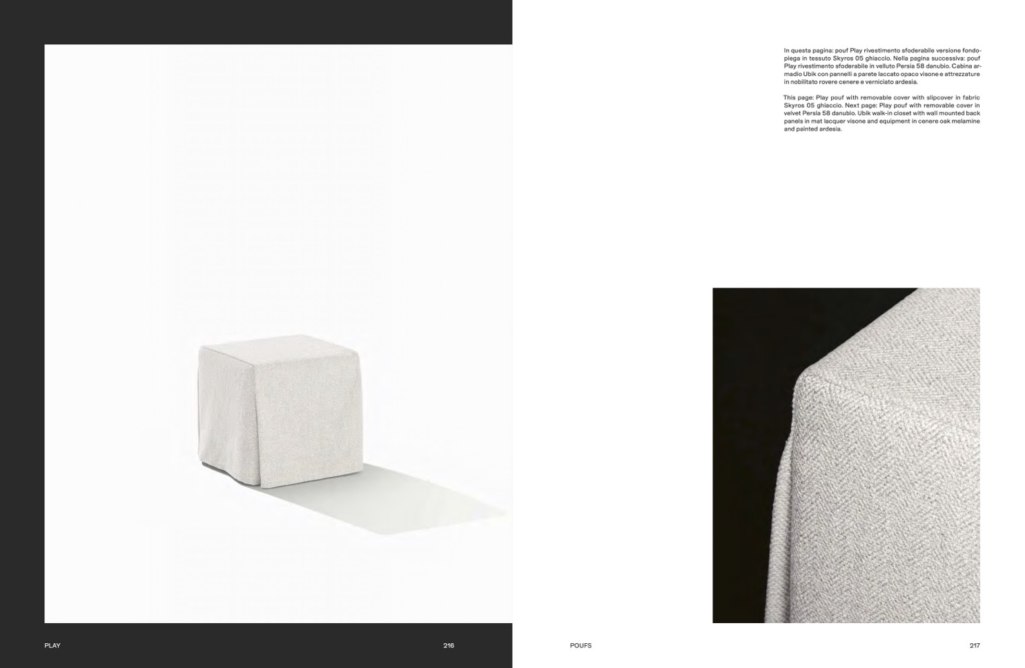 piega in tessuto Skyros 05 ghiaccio. Nella pagina successiva: pouf