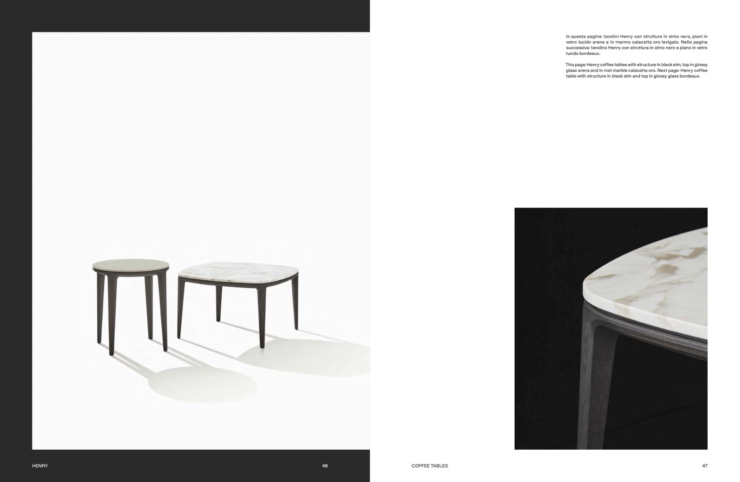 In questa pagina: tavolini Henry con struttura in olmo nero, piani in