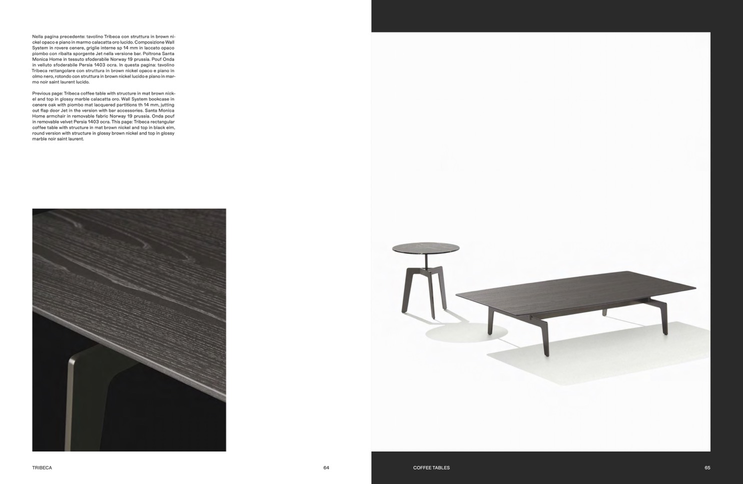 Nella pagina precedente: tavolino Tribeca con struttura in brown ni-
