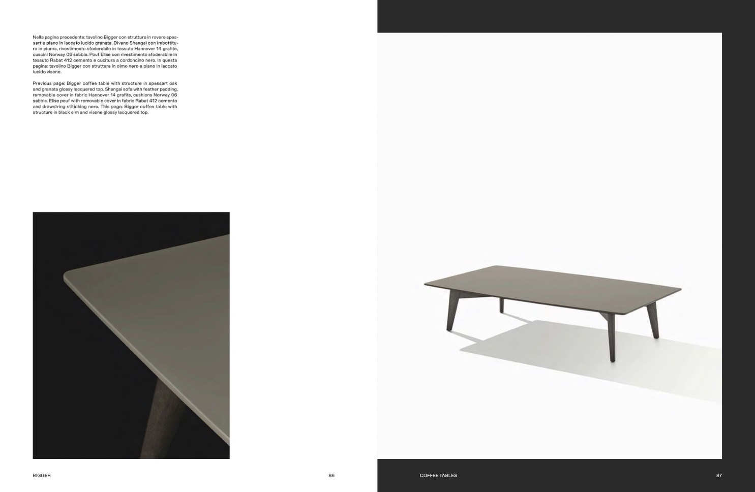 Nella pagina precedente: tavolino Bigger con struttura in rovere spes-