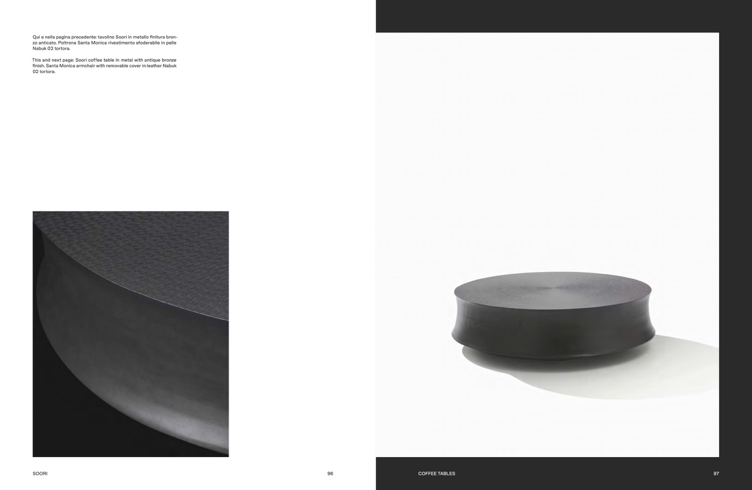 Qui e nella pagina precedente: tavolino Soori in metallo finitura bron-