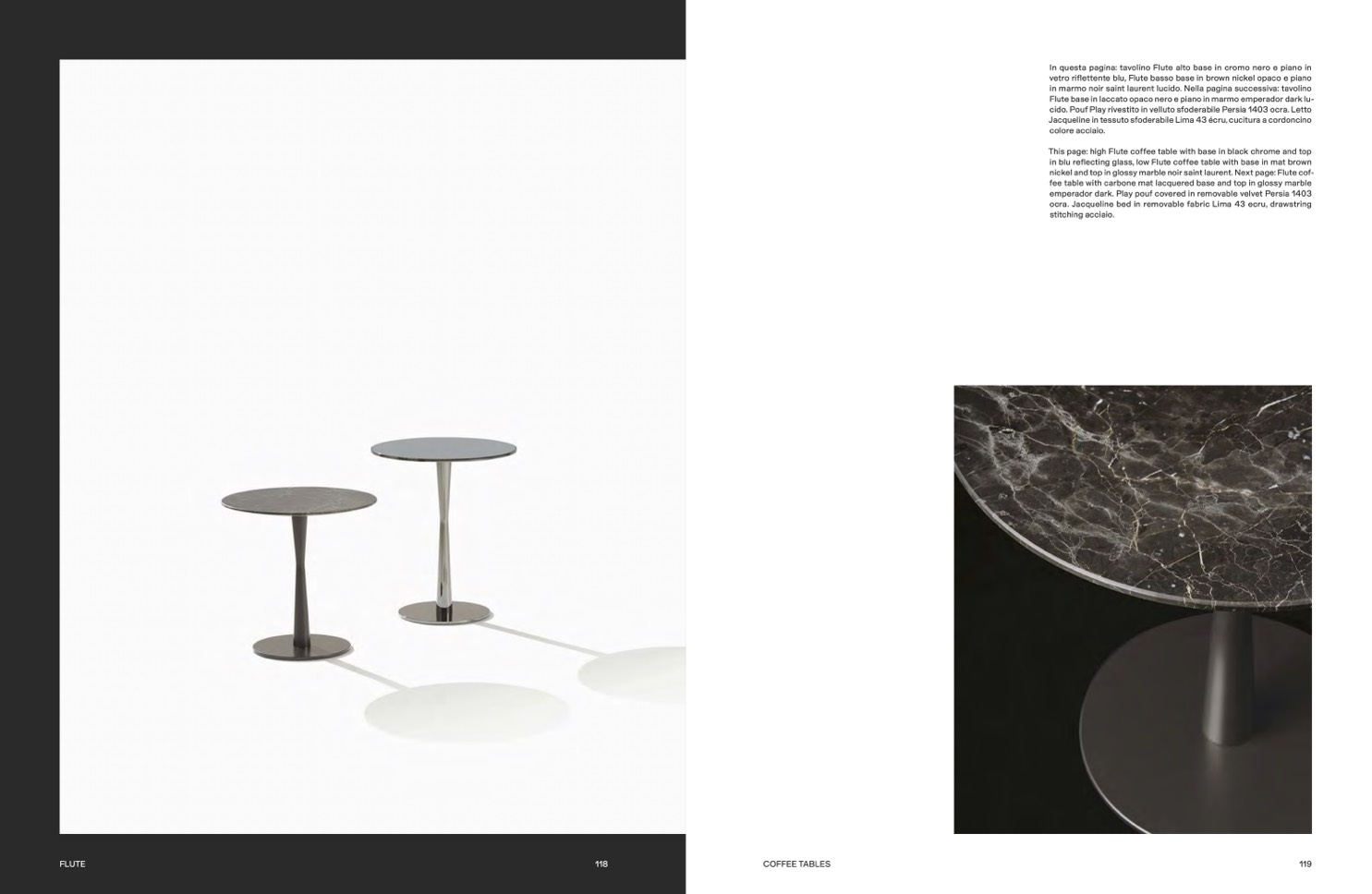 In questa pagina: tavolino Flute alto base in cromo nero e piano in