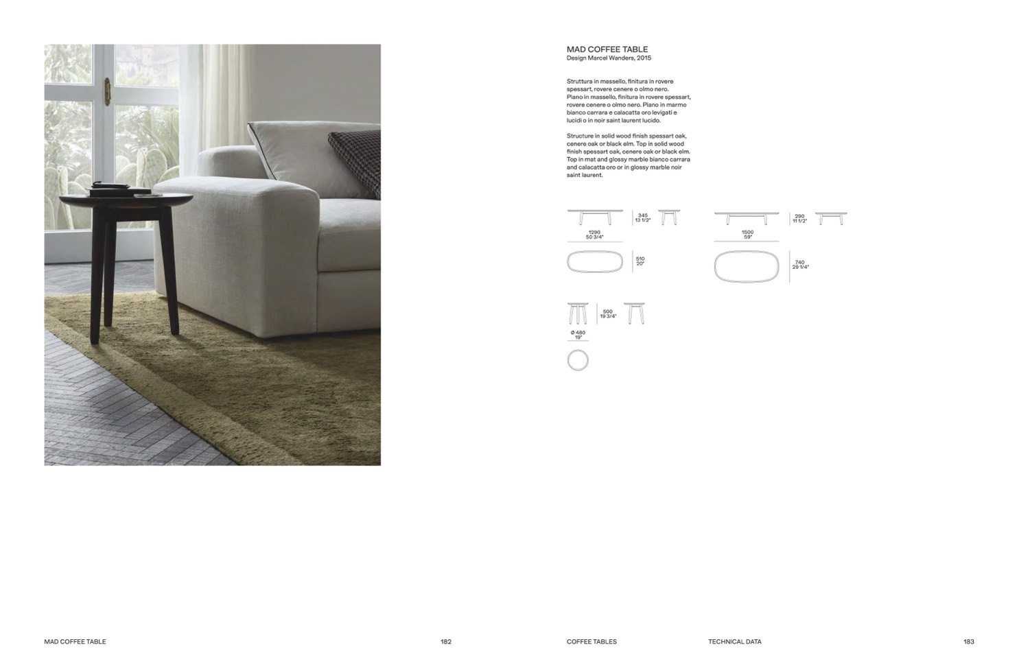 finish spessart oak, cenere oak or black elm.