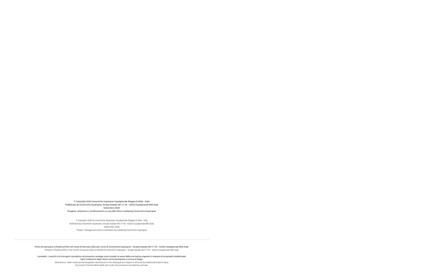 Printed in Modena (MO) in the month of January 2021 on behalf of Ceramiche Supergres - Strada Statale 467, n° 34 - 42013 Casalgrande (RE) Italy.